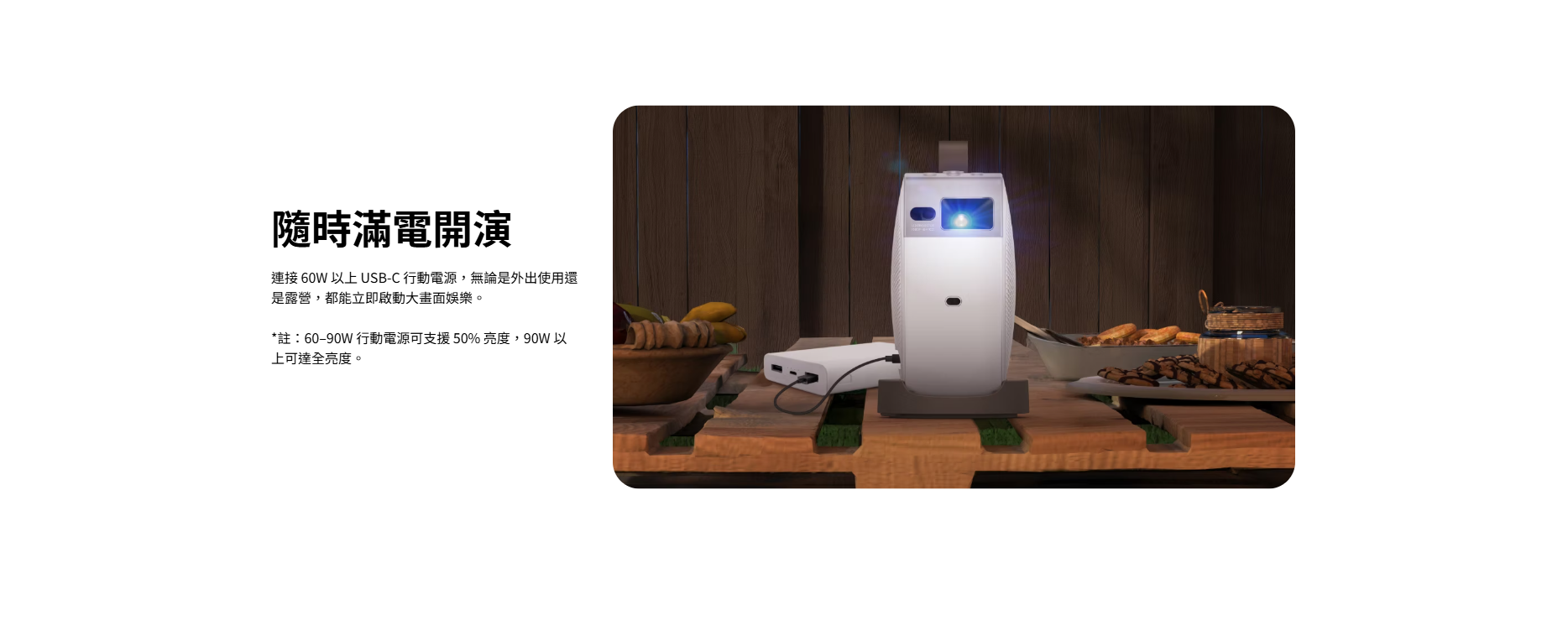 .便攜設計:輕巧機身,支援 Type-C 行動電源供電,隨時隨地投影