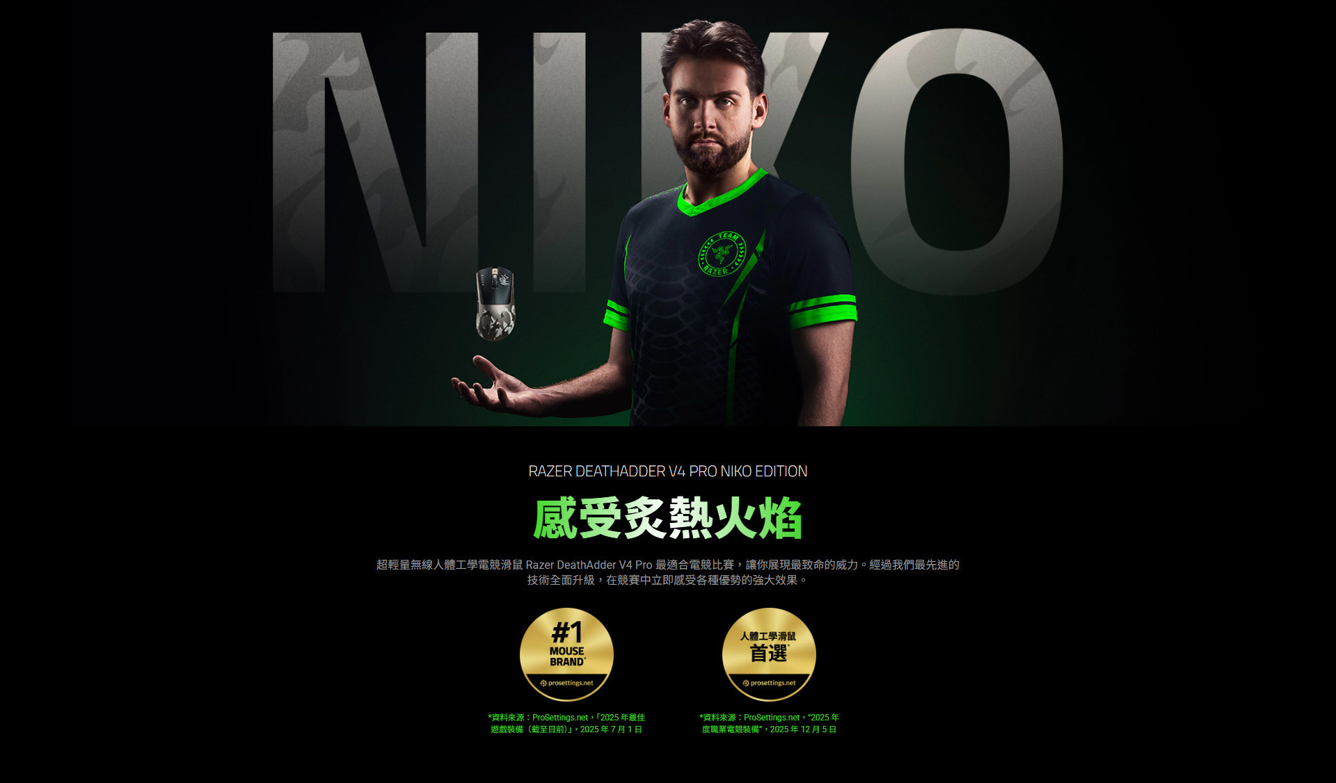 Razer 攜手 CS 傳奇步槍手 NiKo 推出頂規聯名系列周邊 結合專屬火焰元素,靈感來自 NiKo 的「沙鷹之王」稱號,致敬他奪下生涯第 10 座 CS MVP 的傳奇時刻。